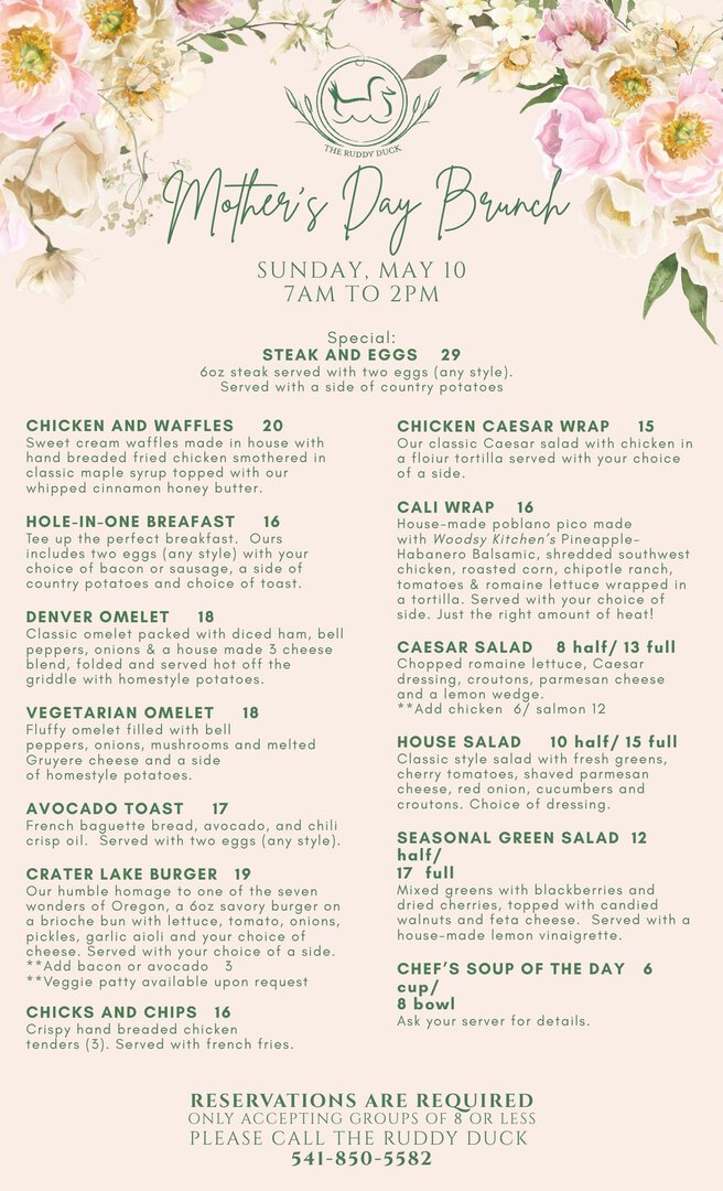 Treat Mom to a special à la carte brunch at the Ruddy Duck, featuring a Steak & Eggs special and a full menu of brunch favorites — from Chicken & Waffles to the Crater Lake Burger.